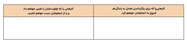 پس از تشخیص حوزههایی که نیازمند توجه شما هستند، باید برای دستیابی دوباره به تعادل، برنامه ریزی کنید. با حوزههایی شروع کنید که در مورد آنها غفلت کردهاید. برای بازگرداندن این حوزهها به تعادل، چه کارهایی باید انجام دهید؟ در حوزههایی که فراتر از سطح ایدهآلتان به آنها توجه کردهاید، از چه کاری میتوانید دست بکشید، اولویت بندی چه کاری را میتوانید تغییر بدهید یا رسیدگی به چه کاری را میتوانید به شخص دیگری واگذار کنید؟ نوشتن این برنامهها روی یک کاربرگ مانند زیر، به شما کمک میکند تا نسبت به انجام آنها متعهد شوید.